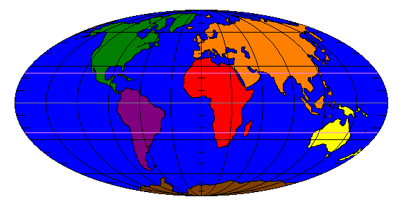 Kartan nedan visar vilka breddgrader, som kontinenterna sträcker sej över: